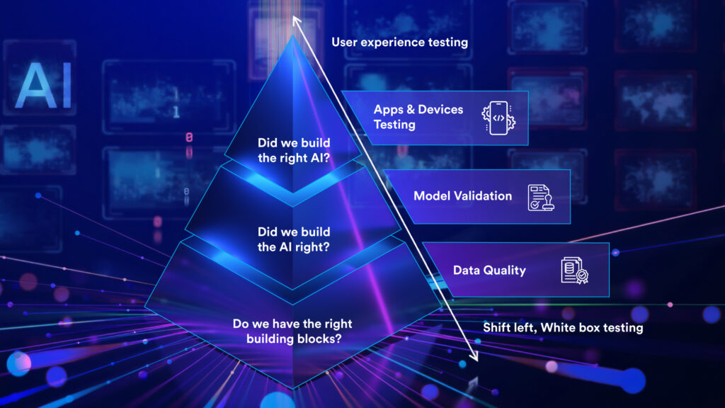 The top of the pyramid is the full system experience. Here, the objective is to confirm that AI-enabled workflows behave predictably across UX interactions, via APIs, through security layers, under different conditions of performance, and within real-world contexts. This layer ensures that the AI is not just correct but usable, interpretable, and aligned with business expectations – ultimately answering the question, did we build the right AI?